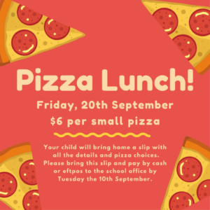 The PTFA Team is organising a Pizza Lunch for all children on Friday the 20th of September. Please use the order form that has been sent home and place your orders at the office.